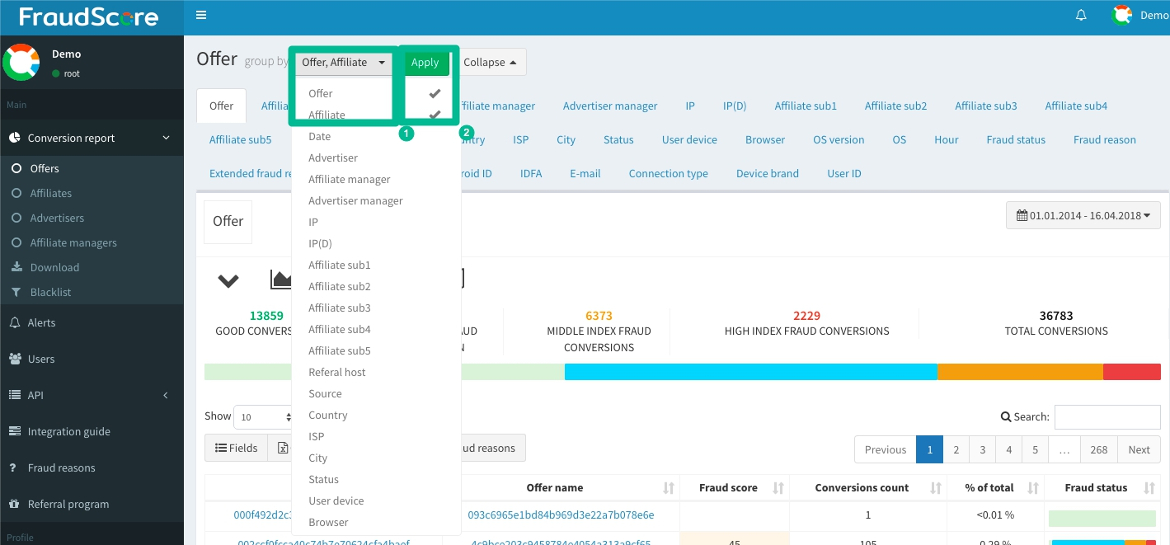 • FraudScore’s fraud monitoring system is particularly useful in this regard as it allows daily check on affiliates conversions and indicates the level of fraud detected for each conversion. The fact that the system not only monitors normal desktop traffic, but, also tracks and accurately reports on mobile traffic in relation to Emulators, VPN’s, Bot farms and IP pattern recognition allows us to make informed decisions when reviewing assigned affiliate caps and encouraging more traffic.