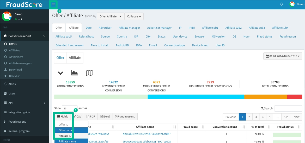 As new columns appear, the report table will expand. So you may need to make it fit the screen. To do this, click “Fields” in the toolbar right above the table and (1) choose the minor parameters to unmark (to hide them) in the drop-down menu. You can also (2) collapse the main toolbar on the left by clicking the button with three lines on the top near the logo.